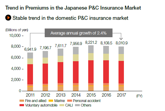 The domestic P&C insurance business is predicted to account for about 50% of the Group’s adjusted profit (fiscal 2019 forecast). Going forward, we aim for this business, which is the largest business segment, to contribute further to the Group’s growth.