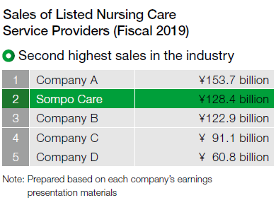 In the Mid-Term Management Plan’s fourth fiscal year, fiscal 2019, the main operating company of the nursing care & healthcare business, Sompo Care, achieved an occupancy rate of 91.5% for serviced residences, only slightly below the target set at the beginning of the fiscal year. Nonetheless, thanks to productivity enhancement and cost reduction measures, Sompo Care’s adjusted profit surpassed the initial