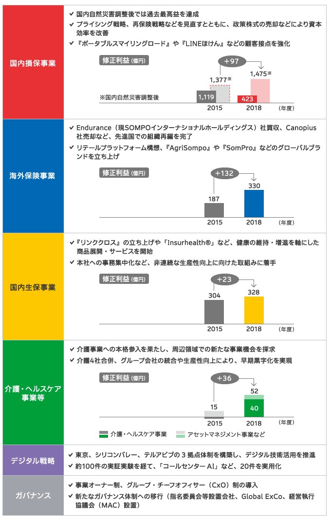 このチャレンジを確実に遂行していくため、2018年度までの3年間では、「安心・安全・健康のテーマパーク」の実現に向けた基盤づくりを着実に進めています。事業オーナー制やグループ・チーフオフィサー(CxO)制の導入、指名委員会等設置会社への移行やGlobal ExCoの設置といったコーポレート・ガバナンス機能の強化をベースとして、国内損保事業ではプライシング、再保険戦略の見直しや政策株式の売却などによる資本効率の改善、海外保険事業では先進国の組織再編、リテールプラットフォーム構想などを立ち上げました。そして、国内生保事業では「健康応援企業」への変革に向けた『リンククロス』の立ち上げや「Insurhealth®」を軸とした商品・サービスの展開、介護・ヘルスケア事業では介護4社合併やグループ会社統合による生産性向上など、各事業で優位性確立と強化を進めてきました。加えて、2016年度のEndurance(現 SOMPOインターナショナルホールディングス)買収に代表されるM&Aによる成長加速や新たな事業機会の探求、認知機能の低下予防から認知症ケアまで幅広くサポートする「SOMPO 認知症サポートプログラム」の展開といった事業間連携(グループ横断)によるトータルサポート、世界3極体制のSOMPO Digital Labから集めた最先端の知見・技術を活用したデジタル戦略の推進など、さまざまな取組みを実行しています。